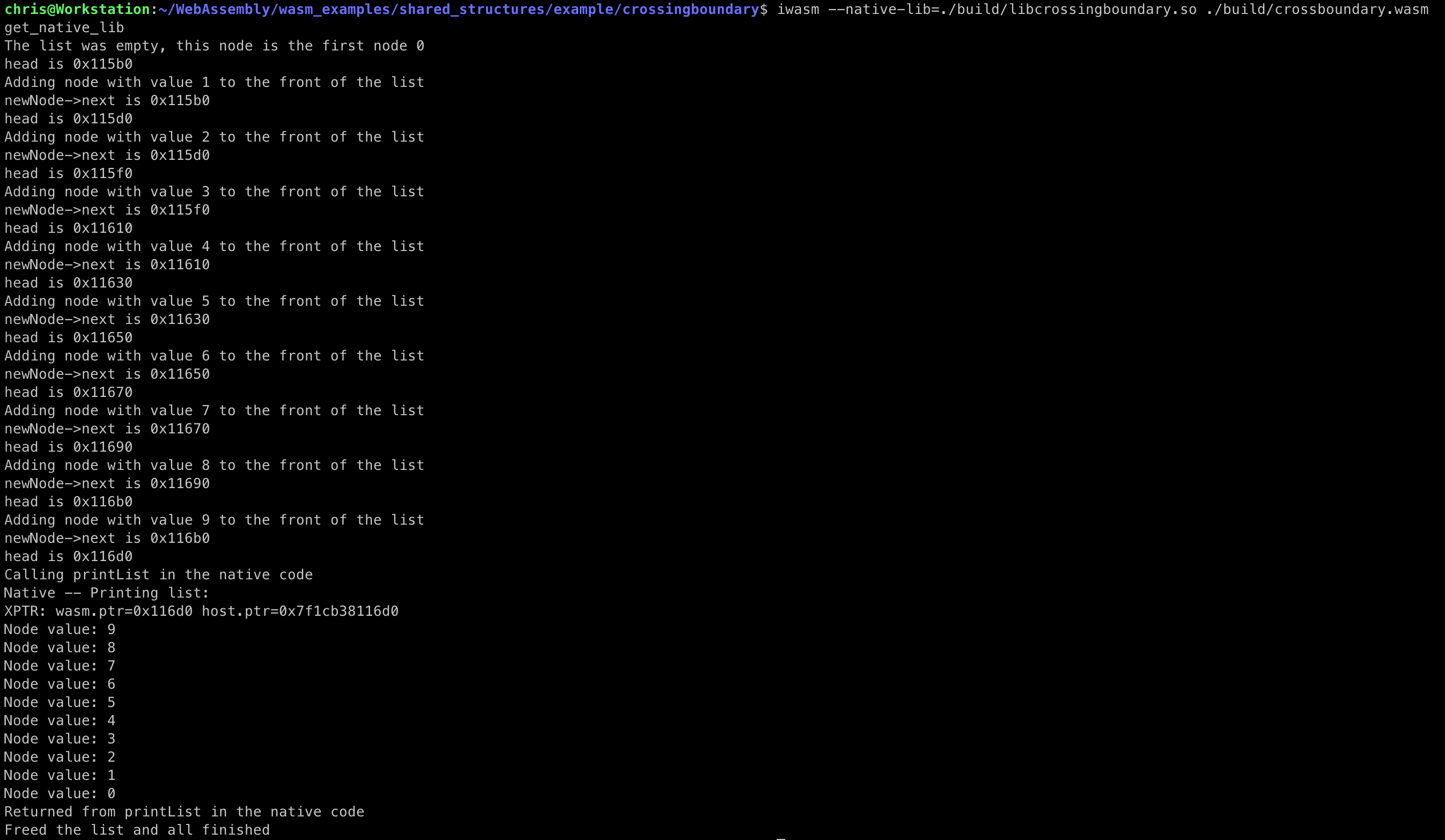 And it shows the linked list being populated by 32bit WebAssembly code and then iterated over via some host code: